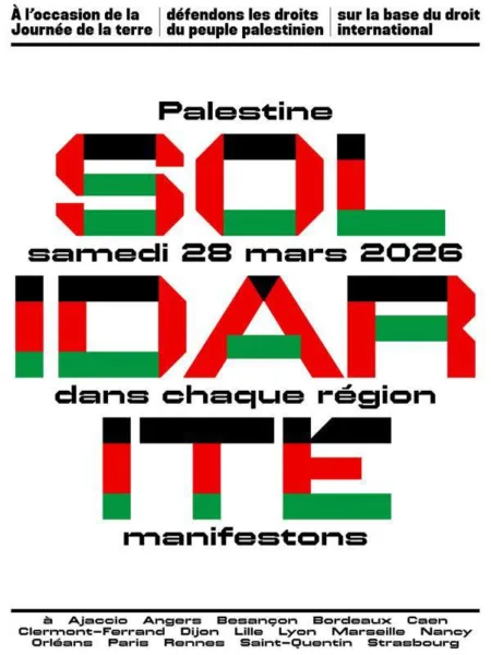 À l’initiative de l’Association France Palestine Solidarité (AFPS), une grande journée nationale de manifestations unitaires est organisée le samedi 28 mars. Cette initiative est soutenue par un collectif de 90 organisations. Les militantes et militants de l’Alliance Pour la République Ecologique et Sociale (L’APRÈS) sont appelé·es à se mobiliser pleinement pour la réussite de cette initiative indispensable.