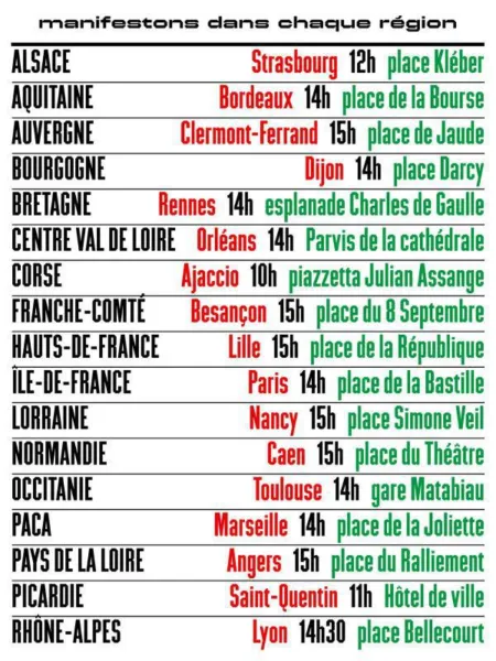 Des mobilisations seront organisées dans les villes suivantes : Strasbourg, Bordeaux, Clermont-Ferrand, Dijon, Rennes, Orléans, Ajaccio, Besançon, Lille, Paris, Nancy, Caen, Toulouse, Angers, Périgueux, Saint-Quentin, Marseille et Lyon.